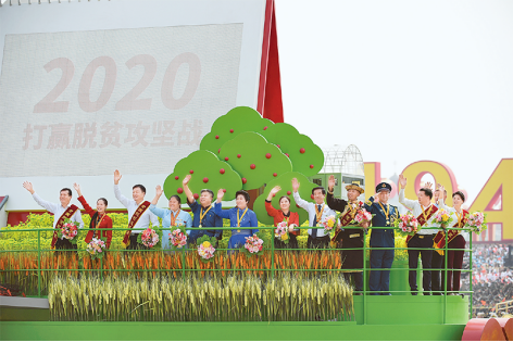 2019年10月1日上午,庆祝中华人民共和国成立70周年大会在北京天安门广场隆重举行。这是群众游行中的“脱贫攻坚”方阵彩车。新华社记者 李尕/摄