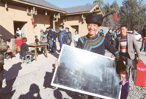 2019年2月11日,四川省凉山州昭觉县三岔河乡三河村首批29户、168人告别居住多年的土坯房,搬入易地扶贫安置点的新家。图为彝族群众喜搬新居。 新华社记者 江宏景/摄